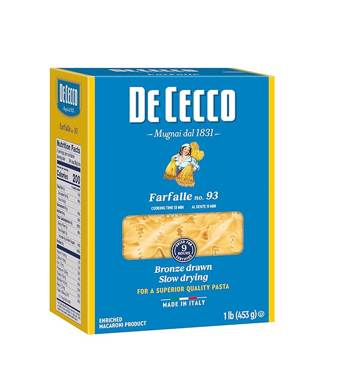 - De Cecco Farfalle No. 93 Pasta delivers authentic texture, taste, and quality for perfect meals.